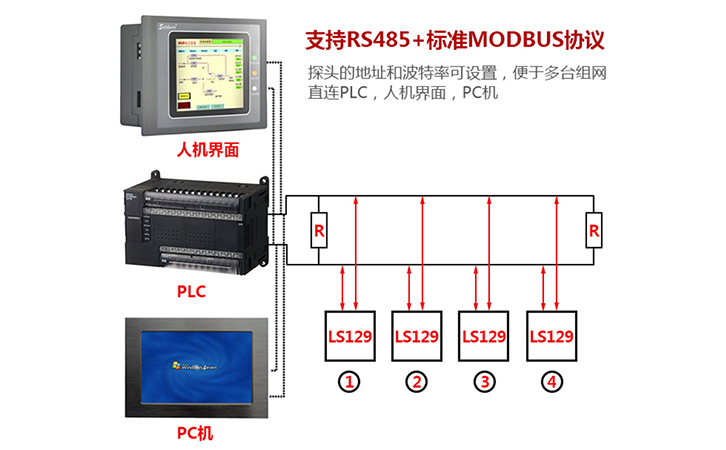 ? ? ? ?LS129 數字探頭支持標準的MODBUS協議,默認通訊地址為“1”。可以通過“人機界面調試工具”或通訊協議修改探頭通訊地址,地址設置范圍:1-247。